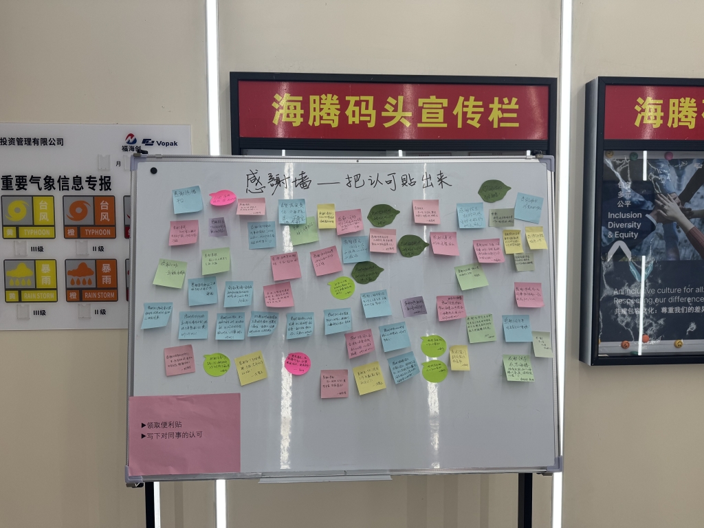 活动设置了两大核心互动环节,形式新颖且富有意义。在“感谢墙----把认可贴出来”环节,大家领取专属便利贴,认真写下想感谢的同事姓名、班组或团队名称,并细致分享对方在工作中的闪光点。一张张满载心意的便利贴贴满白板,不仅是对同事工作的真诚肯定,更成为传递团队温暖的纽带,让大家在被认可中切实感受到工作的价值与意义。而在“包容树----为团队添承诺之叶”环节,大家领取“树叶”形状的便利贴,一边思考一边写下自己喜欢的公司文化细节,同时许下对践行包容理念的小承诺。随着一片片“树叶”贴上树干,包容之树逐渐枝繁叶茂,象征着全体同事共同培育包容文化的决心与行动,也让公司的包容文化在每一份承诺中落地生根。